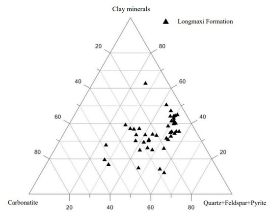The measurement results show that the mineral composition of shale rock samples includes clay minerals, quartz, feldspar, calcite, dolomite and generally contains pyrite. The mineral components are divided into three categories: clay, carbonate minerals, quartz and feldspar (brittle minerals), and a triangular diagram of mineral components is drawn, as shown in Figure 4. The results show that the content of clay minerals is 10–50%, with an average of 33.2%; quartz and feldspar (brittle minerals) are mainly in 30–60%, with an average of 43.7%; and carbonate minerals are less than 40%, with an average of 19.3%. Brittle minerals represented by quartz and feldspar are rich in content, and clay content is relatively small, with typical mineral characteristics of shale gas reservoirs [28].