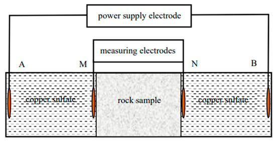 According to the relevant data of the study area, the formation water resistivity saturated core is simulated, and the salinity is 40,000 mg/L. The measuring instrument is impedance analyzer, and the complex resistivity of rock samples is measured by quadrupole method. The schematic diagram is shown in Figure 5. A and B are the power supply electrodes, and the impedance analyzer provides alternating current with different frequencies (0.01 Hz~10 kHz in this experiment). M and N are the measurement electrodes, which measure the potential difference between the two ends of the rock sample. After the calculation of the built-in algorithm, the impedance analyzer can measure the complex impedance of the rock sample and then calculate the required complex resistivity according to the resistivity formula in combination with the length and cross-sectional area of the rock sample.