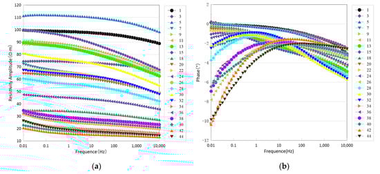 According to the experimental measurement of complex resistivity, the amplitude of complex resistivity of 44 samples taken from shale gas producing horizon ranges from 10 to 115 Ω·m, with low resistivity, and the phase amplitude of some samples changes obviously. Part of the measured complex resistivity data of the rock sample is presented in a map, as shown in Figure 6.