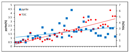 The mineral composition of shale is very complex, and previous studies have found that some mineral compositions have a great influence on the development of shale gas reservoirs. The indicative parameter for evaluating shale gas reservoir is the total organic carbon content (TOC) of the reservoir. The larger the TOC, the greater the organic matter abundance of the reservoir, and the greater the gas content of the corresponding reservoir. According to previous scholars’ research, pyrite in shale gas reservoir can well characterize its organic matter deposition, which is also verified by the data in this paper. As shown in Figure 7. With the increase of sampling core depth, the pyrite content gradually increases, and the TOC content of rock samples also increases synchronously, that is, there is a strong correlation between pyrite and TOC content, and the existence of pyrite will also lead to more obvious induced polarization effect of rocks.