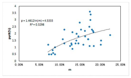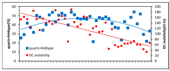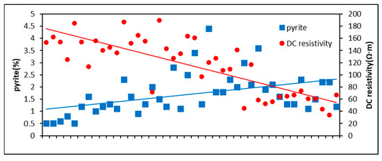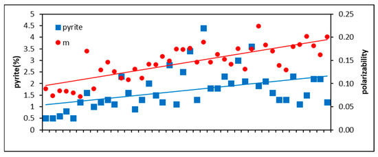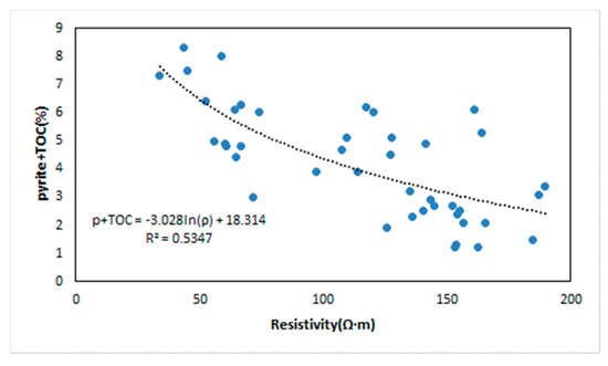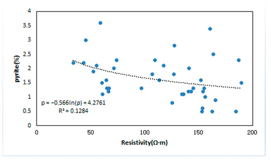 The overall pyrite content is between 0.5% and 3%, the polarizability is basically between 6% and 20% and the corresponding resistivity is between 25 Ω·m and 170 Ω·m, which shows that with the increase in the content of electronic conductive minerals (pyrite) in shale reservoir rocks, the polarizability of rocks increases correspondingly, and the resistivity decreases with the increase in conductivity. From the crossplot, as shown in Figure 14 and Figure 15, it can be seen that although the trend of curve fitting of the crossplot is consistent with the theory, the overall level of curve fitting R2 is not high. However, it can be clearly seen that the correlation between polarizability and pyrite is better than that between resistivity and pyrite. The resistivity is comprehensively influenced by the content of electronic conductive minerals, particle size and structure, while the polarizability is mainly influenced by electronic conductive minerals, so its sensitivity is better than the resistivity.
