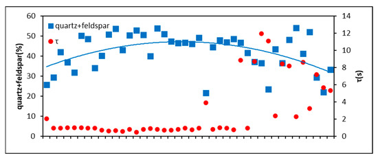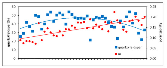 In this paper, the total content of quartz and feldspar is used to characterize the brittle mineral content of rock samples. From the relationship diagram, it can be seen that with the increase of depth, the brittle mineral content keeps increasing at first and then decreasing. Since the core 38 (depth 2495.0 m), with the increase of depth, the resistivity decreases to below 70 Ω·m as a whole, the time constant value and frequency correlation coefficient value increase, the demarcation line is obvious, and the increase rate of polarizability is not large, all of which remain at about 20%, which may be related to the particle size and connectivity of the electronic conductive minerals.