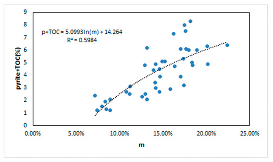 Because pyrite is the product of organic matter degradation in marine sediments and a common mineral in anoxic sedimentary environment, the content of TOC and pyrite is regarded as an important index of organic matter enrichment, and the relationship between IP parameters and the total content of TOC and pyrite is analyzed, as shown in Figure 16 and Figure 17. It can be found that the trend of fitting curve is consistent with the theory, and the fitting degree R2 is much higher than that of single comparison of the relationship between pyrite content and IP parameters; that is, the total content of TOC and pyrite has a higher correlation with IP parameters. It is related to the correlation between TOC content and pyrite content [30].