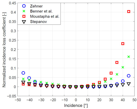 Even though the Stepanov loss model does not include any specific geometrical blade row parameters, it agrees reasonably well in the positive incidence region (up to approximately i = +30°) with a more complex Zehner model. However, at higher incidence angles, the Zehner model predicts higher incidence losses. This is due to the sensitivity of the model to the characteristics of the blade row geometry. In the negative incidence region, these two models start to diverge more significantly from approximately i = −25°.