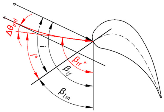 Induced incidence is due to the velocity circulation around the blades. This, in addition to generating lift force, also deforms the streamlines entering the blade row. Therefore, the inlet velocity vector will attack the blade row at a different angle from that given by the velocity diagrams (see Figure 2). Figure 2 shows a profile on which the streamline is attacking with a significantly negative incidence. Due to the velocity of circulation, the inlet streamline curvature occurs near the profile, changing the inlet angle from the original value of β1f to a new (in this case smaller) value of β1f*. The actual incidence angle i* will therefore be slightly smaller than the original one.