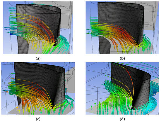 The designation of the turbine stage calculation modes is included in Table 2. Mode “v2” approximately corresponds to the optimally loaded turbine. Details of the streamlines on the bucket leading edge at the mid radius for each calculated variant are shown in Figure 5.