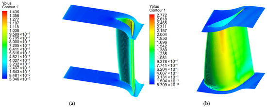 Total pressure, total temperature velocity vectors and a turbulence intensity of 5% were chosen as the boundary conditions for the numerical simulation. The quality of the computational mesh was verified using the y+ parameter. The contours of y+ on the nozzle and bucket surface are shown in Figure 6. The local maximum of y+ is approximately 1.44 for the stator blade and about 2.77 for the bucket. On most surfaces, the value of y+ is less than 1.
