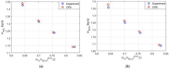 The calculated results were compared with the experimental data to verify the numerical simulation. In the first step, the mass flow rates were compared (see Figure 7). The largest deviation of the mass flow for the nozzle is 0.9%, and for the bucket it is 1.4%.