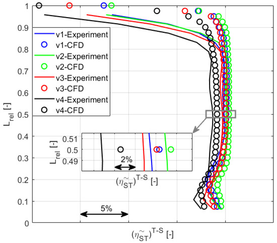 The radial distribution of the turbine stage efficiency (T-S) is shown in the graph (Figure 8). In the hub region, a similar trend of both dependencies can be observed. However, in the blade tip region, more significant deviations between the experimental results and CFD are observed. While the experiment shows a rapid decrease in efficiency from approximately 80% of the blade length, this efficiency decrease in the CFD trend occurs at 95% of the blade length. The main reason for this deviation is due to the effect of the design holes for the movement of the pneumatic probes, which create an unstable flow field in the blade tip region. Therefore, there is a local increase in losses. Since these holes were not part of the numerical model, their influence was not included in the CFD simulation results. Another possible reason for the different efficiency values at the blade tip region is the tip leakage flow effect. The mixing of the leakage flow with the main flow significantly disturbs the flow field and creates vortex structures that greatly distort the pneumatic probe measurement results.