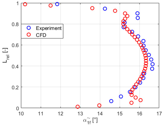 Validation of CFD simulations further focused on the results of the flow angle distribution, especially the directly measured nozzle output absolute velocity angle (Figure 9 and Figure 10). The evaluation planes of the CFD simulation were identical to the measurement planes of the pneumatic probes. The radial distributions of α1f (mode “v1”) are shown in Figure 10.