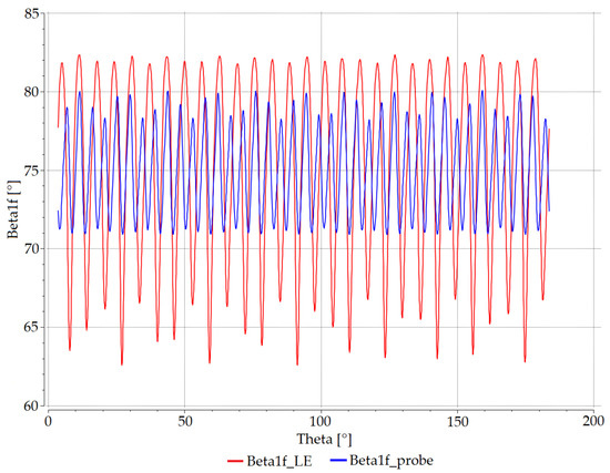 The flow enters the bucket at a relative angle β1f. The following figure (Figure 11) plots the unaveraged circumferential distribution of β1f from the data of the probe measurement plane (“Beta1f_probe”) and from the data of the plane close to the bucket leading edges (“Beta1f_LE”).
