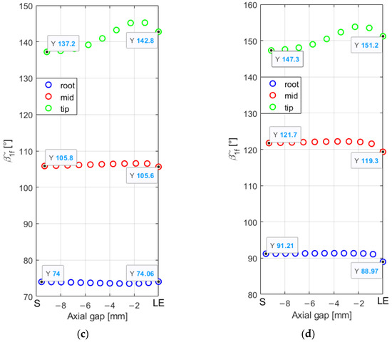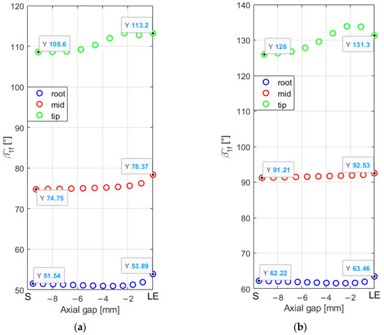 The graphs (Figure 12) show the change in the mass-averaged angles β1f at the root, mid and tip blade profiles in the axial gap from the probe plane (“S”) to the bucket leading edge (“LE”). From the root profile point of view, the largest angular difference can be seen for the “v1” operating mode . For operation mode “v4”, the difference at the root profile is approximately . The mid profile also shows the largest difference for the “v1” mode, namely . In the design mode (“v2”), there is a change of . The most significant angular difference is at the bucket tip, with the largest difference in the “v3” mode (up to ). This tip region is greatly affected by the flow into the tip seal, and therefore this region was not analysed further.
