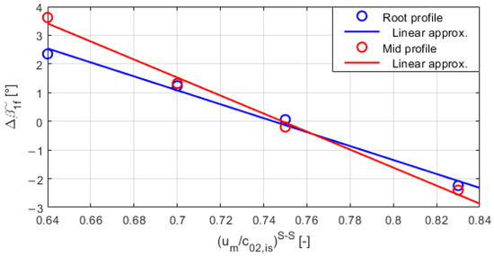 The following graphs (Figure 13) show the angular differences depending on the turbine stage operating mode for the root and mid-blade profiles. A linear dependence of the angular differences is evident for the root and mid radius.