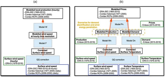 In the first step, which is common to the two models, we reduce the bias of the long time series of surface wind speed and temperature from the ERA20C reanalysis by comparing them to the ERA-5 reanalysis dataset, which is considered to be more reliable and less biased, and performing a quantile-quantile correction. Recall that reanalysis is a procedure wherein a single model for the atmosphere is run over an extended historical period, coupled with an assimilation system, which assimilates all available observations for this period. This results in a long homogeneous time series of the evolution of the atmosphere which represents our best guess of the state of the atmosphere given the available data. For the local production model, in the second modelling step, we downscale the wind speed time series to hourly frequency by generating the missing values from a stochastic wind model. In the third step, we combine the local wind speed with standardized production functions to obtain a time series of the synthetic local wind power production. For the price model, the second step consists in generating long time series of national production and demand, using models whose parameters are estimated from historical data from a recent period. The third step allows to obtain a time series of synthetic prices from the generated production and demand values.