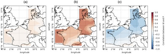 At the hourly timescale (panel (c)), the correlation between prices and production is low but positive (<0.2). At the monthly timescale (panel (d)), wind energy production is significantly positively correlated with prices in all three countries under study. This is due to matching seasonal cycles of wind energy production and prices. Indeed, prices are high during cold seasons when demand increases. At the same time, wind production in Western Europe is also expected to be high during the cold season due to the enhanced activity of the storm track. In the long term (panel (e)), the correlation between wind energy production and prices becomes negative, especially in Denmark and the north of Germany. This may be related to the merit-order effect: a rise in wind production at the national level tends to push the wholesale electricity price down (see [,] for instance). It may also indicate a negative correlation between temperature (whose increase tends to push the demand and thus the prices down) and wind energy production. This correlation can also be related to the large scale weather regimes, such as the North Atlantic Oscillation (NAO) which, in the positive phase, enhances the storm track activity, increasing the wind production in Western Europe, and, at the same time, contributes to increasing the temperature and, therefore, decreasing energy demand and prices, by bringing warmer wet air in this region. In the negative phase, this phenomenon is reversed. The NAO displays long term cycles of the order of 3 to 7 years. Many studies have demonstrated a correlation of the NAO (and other weather regimes) with wind speed and production and electricity demand (see for instance [,]).