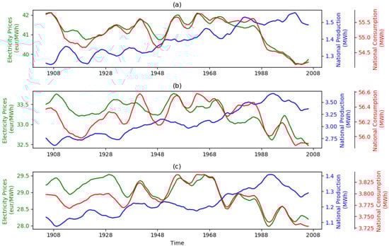 The 10-year moving average of electricity prices (green lines), national electricity consumption (red lines), and national wind energy production (blue lines) in (a) France, (b) Germany, and (c) Denmark.