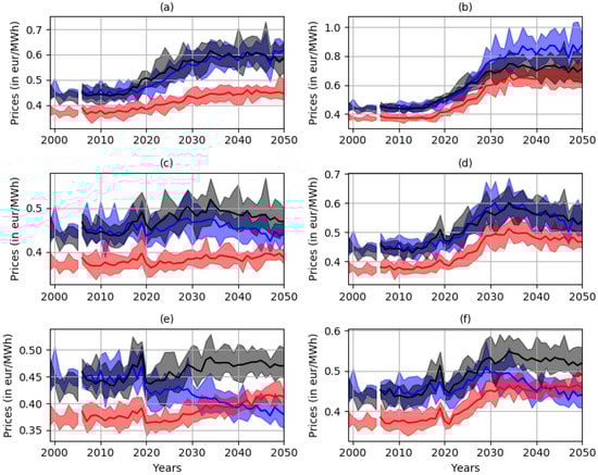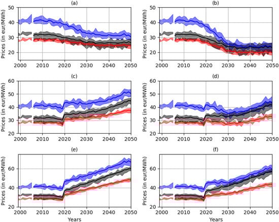 The 10 simulations (5 models and 2 RCPs—filled area) display uncertainties of about 2 €/MWh to 5 €/MWh. The trajectories of the scenarios are firstly driven by electricity consumption assumptions (comparing panels from top to bottom), secondly by wind energy penetration assumptions (comparing left and right panels) and thirdly by the RCP. In the scenario where the demand only depends on temperature, the prices drop slowly between 2010 and 2050 (Figure 5a,b). For a medium and high electrification of the system, the electricity demand increases after 2020, and proportionally so do the prices (Figure 5c–f).