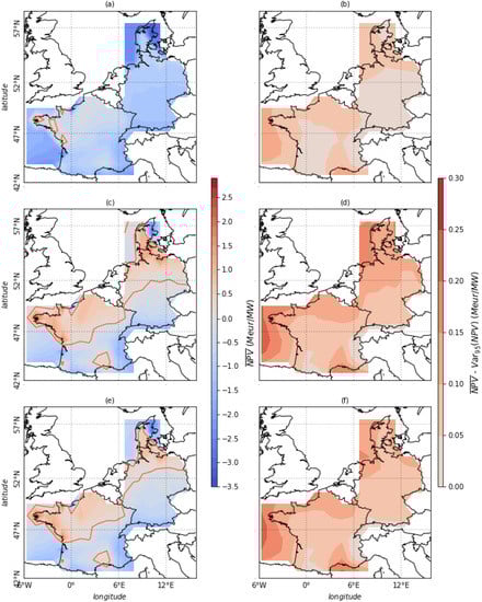 Mean (left) and difference between mean and Value at risk 95th of NPV (right), over the 81 wind farm projects and after 30 years of lifetime for wind farms operating without a subsidy (a,b), with FiT subsidy (c,d), and with FiP subsidy (e,f). The red contour line on left panels displays the line of NPV = 0.