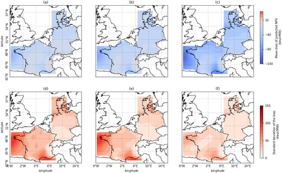 Mean (a–c) and standard deviation (d–f) of the bias calculated between the NPV at the end of a project and the projected NPV based on (a,d) the past 5 years, (b,e) the past 10 years, and (c,f) the past 30 years.