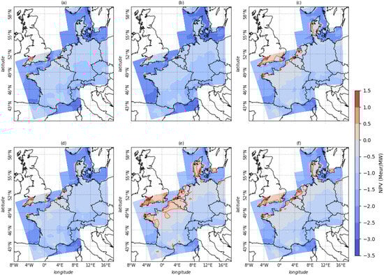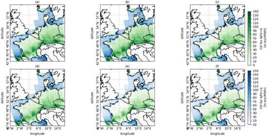 For offshore wind farms operating without subsidies (Figure 7a,b), the NPV is negative due to the high initial investment and costs. Thus, offshore wind farms are not yet profitable if not supported by regulations mechanisms. Nevertheless, both investment costs and operational costs are rapidly decreasing [,,]. For onshore wind farms, small areas in the west of France display small positive NPV of the order of the range between the mean and the 95th percentile of NPV. The difference between the mean and the is small, meaning that the NPV does not vary much on the long term. The standard deviation is less than 5% the mean of the NPV in most of the regions.