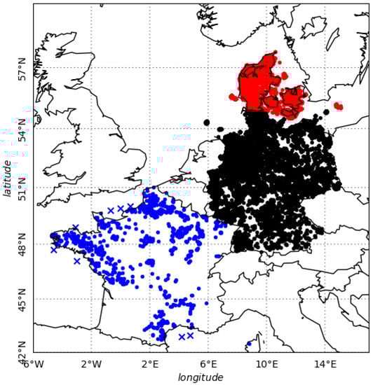 Wind farm location corresponding to current distribution of wind fleet in France (blue points), Germany (black points), and Denmark (red points). Blue cross markers indicate the location assumed for future offshore wind farms in France.