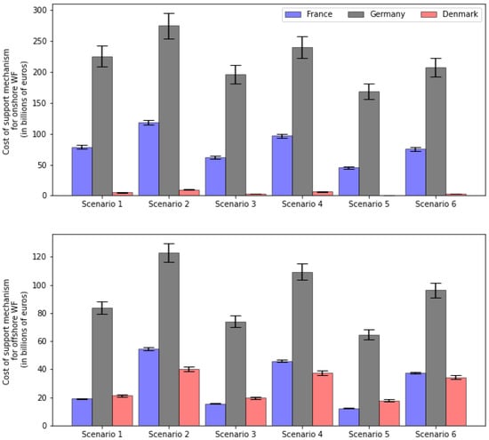 With these data, we are able to calculate the cost of wind energy penetration (onshore and offshore) for each country and in each scenario. Remember that, for scenarios 2, 4, and 6, penetration is high, i.e., total (new) installed capacity in France in 2030 is 41 GW onshore and 11.1 GW offshore; in Germany 71 GW onshore and 20 GW offshore; and in Denmark 6.5 GW onshore and 6.1 GW offshore. In scenarios 1, 3, and 5, penetration is low, i.e., total (new) installed capacity in France is 31 GW onshore and 4.3 GW offshore; in Germany 60 GW onshore and 14 GW offshore; and in Denmark 3.6 GW onshore and 3.4 GW offshore. Note that we not only consider the cost of new installed wind farms, but also that of the replacement of current installed wind farms. Indeed, the vast majority of the currently installed wind farms will arrive at decomissioning date within the next 30 years so that they will need to be replaced to reach the penetration given by our scenarios. The costs are computed by simply adding up the future payments, without discounting, and, as a result, we may slightly overestimate the true costs. However, these are public support policy costs which should therefore be discounted with the sovereign borrowing rate, and the sovereign bond rates are presently quite low.