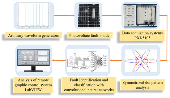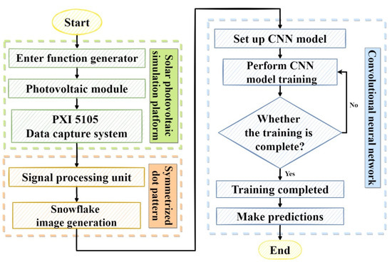 The detection system developed in this study can analyze signals in different PV fault conditions by combining SDP with CNN for diagnosis. Figure 1 shows the overall system detection process architecture. A high-frequency voltage was imported into the different fault models, and the original signal was captured by a PXI high-speed DAQ card from the output signal waveform as the data analysis source of fault diagnosis. SDP then converted the failure data into a snowflake image, and the fault type was identified using CNN.
