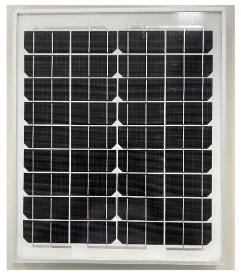 This study used a 20 W monocrystalline silicon PV module, as shown in Figure 3, in the standard test condition (the irradiance level at 1000 W/m2, the mass of atmosphere at air mass 1.5, and the temperature at 25 °C). The rated voltage, rated current, open-circuit voltage, and short-circuit current of the PV module were 18.2 V, 1.10 A, 22.4 V, and 1.19 A, respectively.