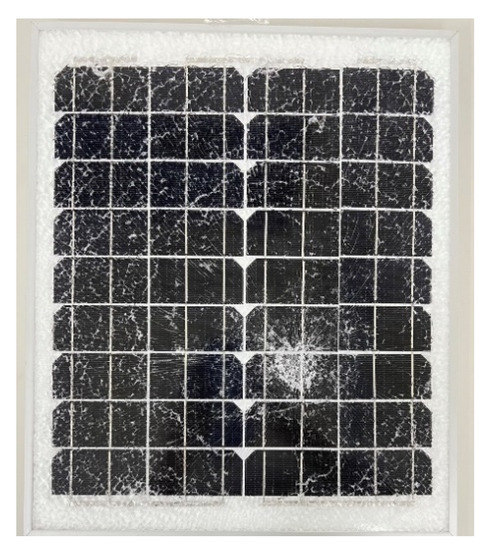 This study used severe and light damage models to study the broken module, as shown in Figure 5 and Figure 6. According to [25], the structure of a module varies with environmental factors. The faults were divided into safety and performance faults. The PV module breakage was a safety fault. This study used an external force for impact damage to the full set of PV modules to simulate the PV module damage induced by human stepping and foreign object damage during construction. The damage extended from the knocking point to the periphery to induce the loss of normal function in other silicon wafers.