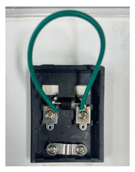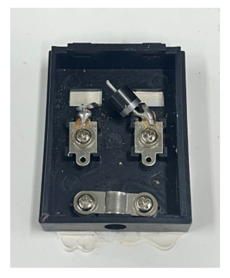 The PV module is inevitably influenced by external factors in the course of PV conversion, and the electricity generation is reduced [26]. The damaged battery or the shielded module area begins to heat up, and the bypass diode exerts a significant effect. The current can pass by the shaded PV module to reduce the hot spot effect. The bypass diode of the normal PV module was shorted in this study. A conductor was welded to short the bypass diode, and the anode of the diode was cut, as shown in Figure 7 and Figure 8.
