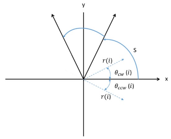 The SDP uses a data acquisition system to convert the data of time-domain square-wave signals into a polar-coordinate feature image. Figure 11 shows the principle of the method, where (i) is the radius of the polar coordinates in the snowflake image; () is the clockwise rotation angle of the x-axis; () is the counterclockwise rotation angle of the x-axis. In the square-wave data sampling of the PV module state signals, the signal sampling point is the ith sampling point of signal x, the signal sampling point is the sampling point at No. time of signal x. These are substituted in Equations (1)–(3). The point of the converted polar coordinate space is O(r(i), (i), (i)). The PV module state signal can be generated by changing the initial rotation angle to form the symmetric image of point coordinates.