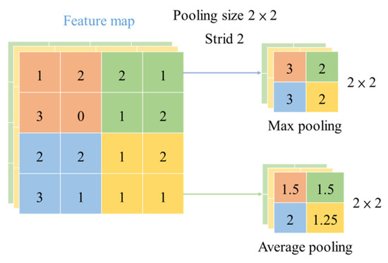 The pooling layer also has a filter to scan the whole image. The pooling layer is divided into two parts: max pooling and average pooling. This process aims to further compress the image data, with the most excellent characteristic of the feature map being reflected. The 4 × 4 image feature, obtained after the convolution layer operation, is cut up into 2 × 2 parts. The maximum value and the average value of the segmented part are extracted and placed in the 2 × 2 matrix of max pooling and average pooling. The data after pooling maintain the essential features of the original image. Figure 14 shows the operation mode of the pooling layer.