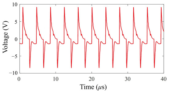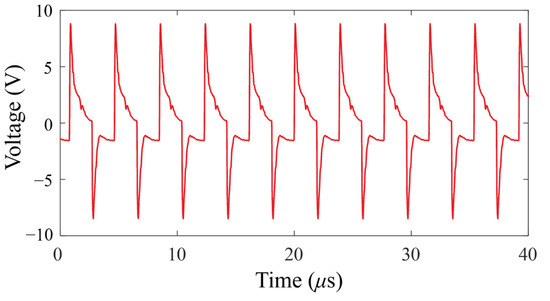 This study had four types of PV modules, including a normal module, a poor connection on the module, module breakage, and bypass diode failure. Four kinds of square-wave output signals measured by this system are shown in Figure 16, Figure 17, Figure 18 and Figure 19. First, a high-frequency 250 kHz signal was imported with the input voltage of a 20 Vape–p high-frequency square-wave signal. The data sampling time was 40 μs, totaling ten periods. The failure data of 3200 points were sampled. As four state models were built, 200 samples of data were extracted from each model, totaling 800 samples for the experiment.