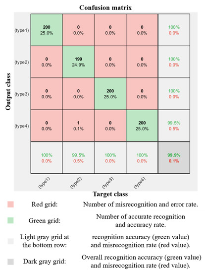 Additionally, the recognition result of the PV modules was displayed in the confusion matrix, as shown in Figure 25. The x-axis is the actual fault type, and the y-axis is the predicted fault type. The green and red grids in the confusion matrix represent the number of accurate recognitions and the number of misrecognitions, respectively. The recognition accuracy and misrecognition rate of the specific fault types are the green and red values in the x-axis light gray grids. The overall recognition accuracy and misrecognition rate are the green and red values in the lower rightmost dark gray grids of the confusion matrix. The overall recognition accuracy is the total value of green grids divided by the total value of green and red grids. Taking Type 2 in Figure 25 as an example, the proposed method correctly identified 199 of 200 test data records with a recognition accuracy of 99.5%. Similarly, the Type 1, Type 3, and Type 4 recognition was 100%. Finally, the total value of the green grids was divided by the total value of green and red grids to obtain the total recognition accuracy rate of 99.88%.