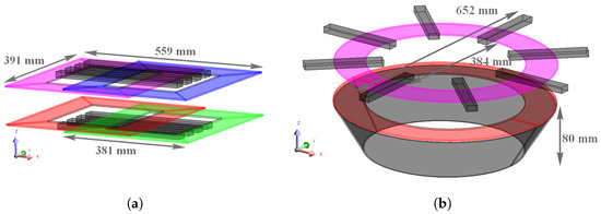 Table 1 presents the operation specifications and some physical constraints of a typical IPT application. The installation area hinges the MC geometry, and it imposes, inadvertently, the lateral tolerance limits and maximum size for the MC. On the other hand, the minimum admissible size for the MC depends on system specifications such as output power levels, air gap and lateral displacement values. One characteristic of non-polarized pads is the total decoupling between the transmitter and receiver pads when the lateral displacements exceed around 40% of the total diameter (d) of the pads [1]. This means the FLCP needs a minimum size of 400 mm to comply with the lateral tolerance of 150 mm, listed in Table 1. An FLCP with a size of 650 mm was selected for evaluation, and it respects the maximum size limit of 800 mm imposed by Table 1. The transmitter and receiver pads of FLCP have the same size, and its dimensions are shown in Figure 2b.