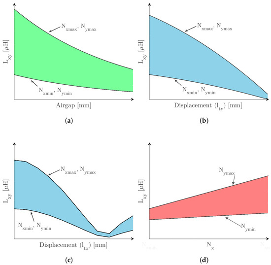 The set of turns in two mutually coupled coils also affects the value of the mutual inductance, as illustrated by the colored areas in Figure 3a–c. At a given and charging position, the value of the mutual inductance exhibits a linear variation, described in (9), if one coil is set with a fixed number of turns (value set between and ), while the other coil is winded between and , as depicted in Figure 3d: