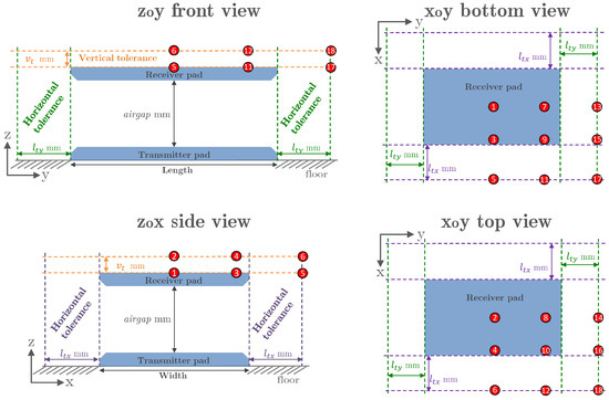 Figure 5 shows the operation area of an IPT system seen from different observation planes. The characterization of is made with the FEA results from specific , identified in Figure 5 with red numbered circles between 1 and 18. Circular-shaped MCs only need six , e.g., 1 to 6, as depicted in side view. The remaining twelve are a consequence of different lateral displacements along the x and y axes in non-circular shaped MCs, such as the BPP. The profiling of as a function of the turns increases the total number of FEA simulations by a factor that corresponds to the number of . For example, the CP requires only one FEA simulation result in each if the number of turns is known. On the other hand, if the number of turns is unknown, the number of FEA simulation results in each increases from 1 to 4, which corresponds to the number of . In short, after identifying the and , the following approach is applied: