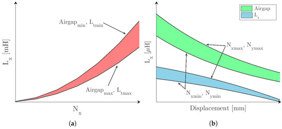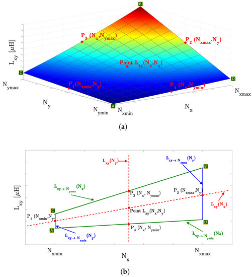 The effect of the number of turns in one coil can be modeled using (9), as depicted in Figure 3d. The characterization of , in a given , can then be made with resource to, at least, four results given by: