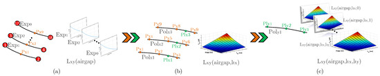 Figure 7. Step by step illustration of the fitting methodology for (a) , (b) and (c) . - Replace in equations to with the desired value to determine in points to , as illustrated in Figure 7a. The new values take into account the effect of the selected set of turns and air gap values.