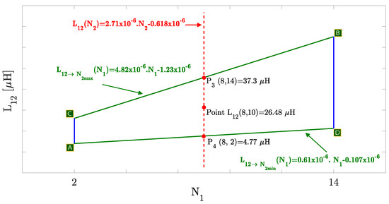 Table 3 lists the FEA simulation results from A to E, described in (13), in each for the FLCP with a size of 650 mm. The first step in the fitting approach method is the identification of in all six . The method described in Section 3.1.1 is applied in detail to 1. Figure 9 illustrates in a 2D view for 1 with all significant values. The corners of the geometric figure correspond to the values of A to D. The linear function between A and D corresponds to a fixed value of two turns () in the receiver coil, while the number of turns of the transmitter is varied, and it is given by: