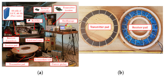 Experimental prototype built in a converted combustion vehicle: (a) Main overview and (b) transmitter and receiver pads.