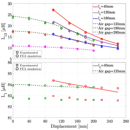 Figure 12 lists the errors between the fitting curves, the experimental data and FEA simulation results for under vertical and lateral displacements. Within feasible displacements, the average error between the experimental data and the proposed fitting is below 3%. The error difference is higher in scenarios where the value of is higher. For example, a charging position outside the displacement specifications listed in Table 1 ((, ) = (280, 200 mm)), corresponding to a coupling factor of 0.06, has an error of 6.8% between experimental and fitting curve (0.58 H). The estimation errors are higher (between 4.2 and 7%) for charging scenarios that exhibit low coupling values (between 0.04 and 0.078). Such charging positions are unfeasible for an efficient high-throughput energy transfer due to the high circulating currents required in the transmitter side. Similar error results are found for , and for that reason, they are not displayed.