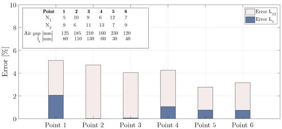 Figure 13 shows the error results between the fitting approach method and 3D FEA simulation results for and with an FLCP size of 650 mm. The comparison is made with the FLCP in six different charging positions and with different sets of turns, as identified in the top left corner of Figure 13. The results show an average error in around 4%, whereas the average error of is inferior at 1%. The highest errors in occur for higher lateral displacement values, such as points 1 and 2. In these cases, the values of are inferior to 10 H and had a variation of just 0.5 H in the fitting approach, which lead to an error of 5%. The estimation of , on the other hand, has average errors inferior to 1%, and in some conditions, such as point 2 and point 3, the error is negligible. This was due to the little effect of the air gap and lateral displacements in the self-inductance values, which reduces the estimation errors. Similar error results were obtained for , and and for this reason are not depicted in Figure 13.