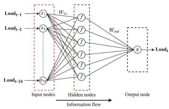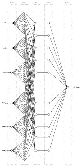 where nh represents the number of the hidden layer neurons, ni is the number of inputs, and no is the number of outputs; l represents an integer between 1 and 10. Here, l equals one. The neural network’s structure [30] is depicted in Figure 1. Loadt−1–Loadt−24 represent the inputs (the load of every hour of the past 24 h), and Loadt represents the prediction for the next hour’s consumption.