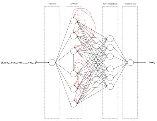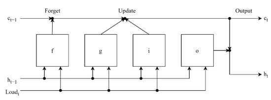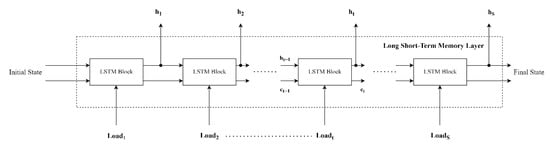 LSTM networks belong to the category of recurrent neural networks specially designed to learn long-term dependencies between timesteps of sequences of data. They consist of a sequence input layer and an LSTM layer. The sequence input layer inputs sequential data into the network, while the LSTM layer learns the long-term dependencies between data timesteps. Figure 4 demonstrates the flow of an electrical Load time series of length S, which flows through an LSTM layer is given, where ht and ct denote the hidden state (the output) and the cell state at time step t, respectively.