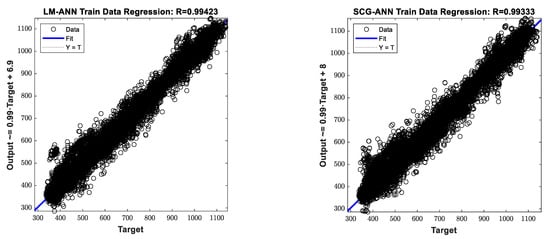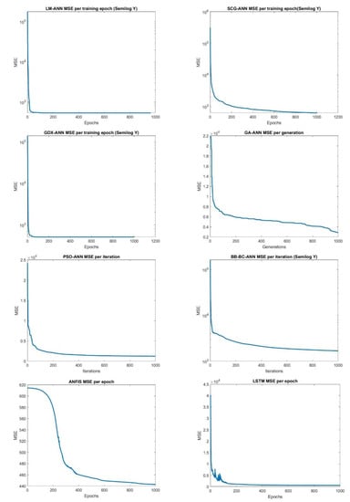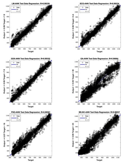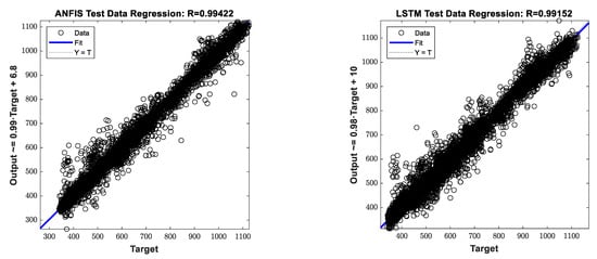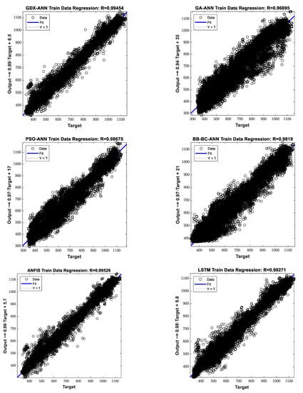 From the plots in Figure 13, the predictions and their respective actual values are almost perfectly matched in the cases of ANFIS, SCG-ANN, LM-ANN, GDX-ANN, and LSTM models, as expected from the Table 3. R-values are close to 1 for these predictors. PSO-ANN and BB-BC-ANN present moderate fitness, while GA-ANN fitness can be described as “poor”, with the lowest R-value of 0.96664.