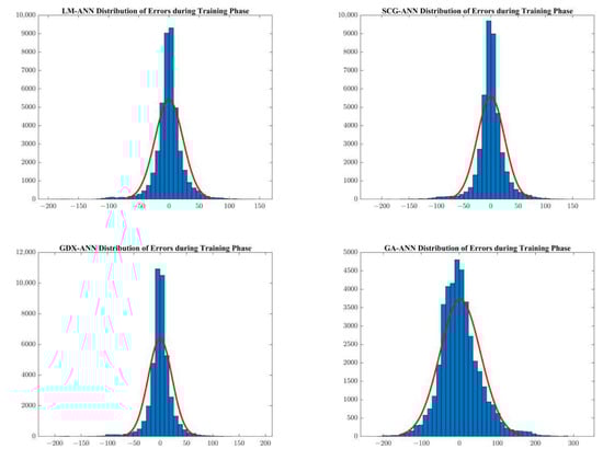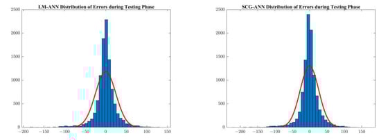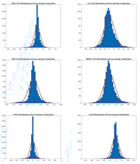 From Figure 12, the distribution of errors for LM-ANN seems to be strongly leptokurtic with a kurtosis of 11.67, exhibiting a “spike” close to zero. The skewness of −0.89 indicates a weak error distribution concentration to the right. SCG-ANN error distribution also has a similar form to LM-ANN error distribution with a kurtosis of 11.25 and a skewness of −0.76. GDX-ANN also demonstrates a large kurtosis of 14.85 and a negative skewness of −1.19. GA-ANN predictor has a kurtosis of 4.73 and skewness of 0.57. PSO-ANN error distribution demonstrates a kurtosis of 7.01 and a skewness of −0.26. BB-BC-ANN error distribution has a kurtosis of 5.17 and a skewness of 0.35. ANFIS error distribution is also strongly leptokurtic, with a kurtosis of 17.91 and a skewness of −0.71.