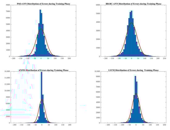 Finally, LSTM network error distribution also demonstrates a kurtosis of 11.07 and a skewness of −0.64. Since the skewness and kurtosis are not zero for any of our models, the error distribution of the testing phase is not normal.