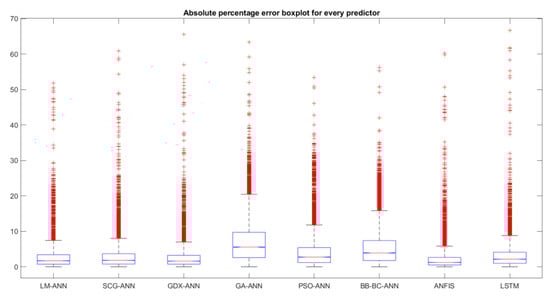 In Figure 14, the model’s accuracy is visually represented since the difference between the upper and the lower quartile, known as the interquartile range (IQR), indicates the distribution of absolute percentage errors for each predictor. As expected, LM-ANN, SCG-ANN, GDX-ANN, and ANFIS achieved low distribution of errors and fewer outliers than the other models. GA-ANN, BB-BC-ANN, and PSO-ANN, likewise, have a large IQR, indicating the spreading of the errors, so the models are not precise.