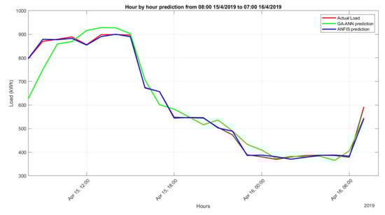 Table 4 shows the MAPE achieved from the predictors over a day’s prediction from 08:00 of 15 April 2019 to 07:00 of 16 April 2019. Again, ANFIS has the best performance, while GA-ANN has the worst. In Figure 15, the predictions obtained from ANFIS and GA-ANN against the actual load are shown. ANFIS prediction almost fits perfectly to the actual load curve, while, on the contrary, GA-ANN’s prediction is poor.
